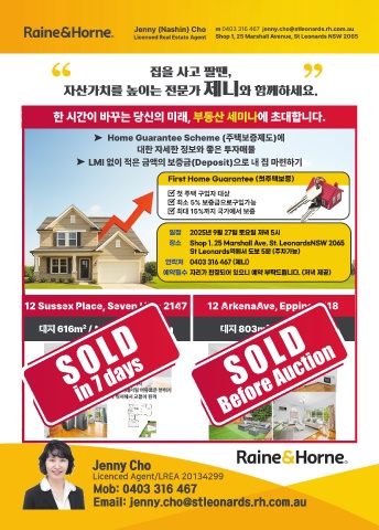 12 Sussex Place, Seven Hills 2147 12 ArkenaAve, Epping 2118 SOLD SOLD 대지 616m² / * Open: Sat 10 am 대지 803m² / 전면폭 24m in 7 days �SevenHills에서 가장 예쁘고 조용한 단지에 위치 Before Auction �집 바로 앞에 Duncan Park이 있어 홈까페처럼 여유로운 분위기 �전철역과 버스정류장이 도보 거리에 위치해서 교통이 편리