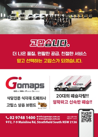 더 나은 품질, 원활한 공급, 친절한 서비스 믿고 선택하는 고맙스가 되겠습니다. 20대의 배송차량!! 식당전문 식자재 도매회사 정확하고 신속한 배송!! 고맙스 상품 브랜드 02 9748 1400 info@gomaps.com.au Ҋझ ਢࢎ www.gomaps.com.au ߄۽оӝ F2, 7-9 Mainline Rd, Strath eld South NSW 2136