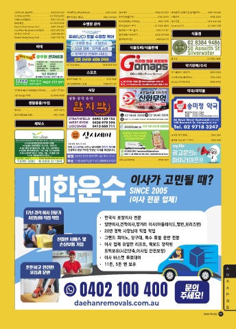 Raine & Horne(Jenny Cho) . . . . . . . . . . 0403 316 467 마포갈비(고스포드) . . . . . . . . . . . . . . . .02 4300 8653 Imventure 25 . . . . . . . . . . . . . . . . . . . . . .02 9645 1355